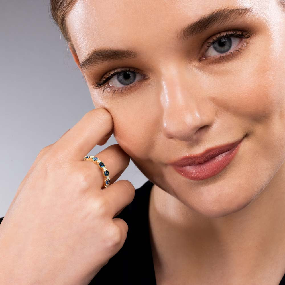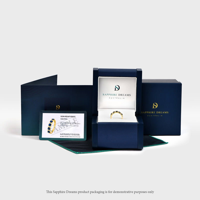 Luxurious and elegant, Octavia features incredible round cut Blue Australian Sapphires and dazzling natural White Diamonds, on an 18ct Yellow Gold band, a durable and long lasting metal. This piece is the ultimate exquisite gift for a loved one.