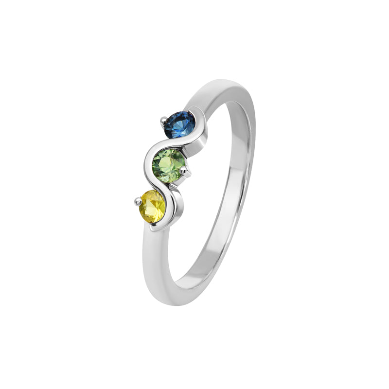 The beautiful Allyra ring is Chic and stylish, featuring three exquisite round cut Australian Sapphires, it can be worn by itself for a subtle everyday pop of colour, or stacked with our other pieces, crafted in 9ct Rose, White or Yellow Gold.