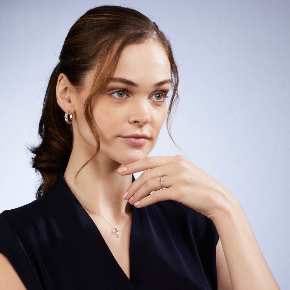 Our Aspen Pendant is a simple cross pendant with a single Australian sapphire. The pendant features a trendy hammered satin finish with an adjustable chain at 40cm, 43cm and 46cm. This necklace comes in 9ct Rose, White and Yellow Gold.