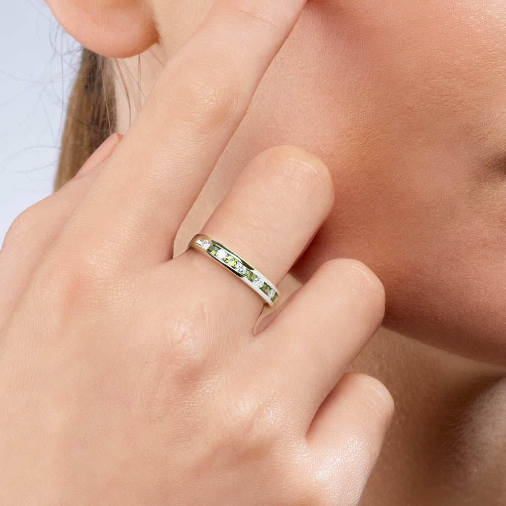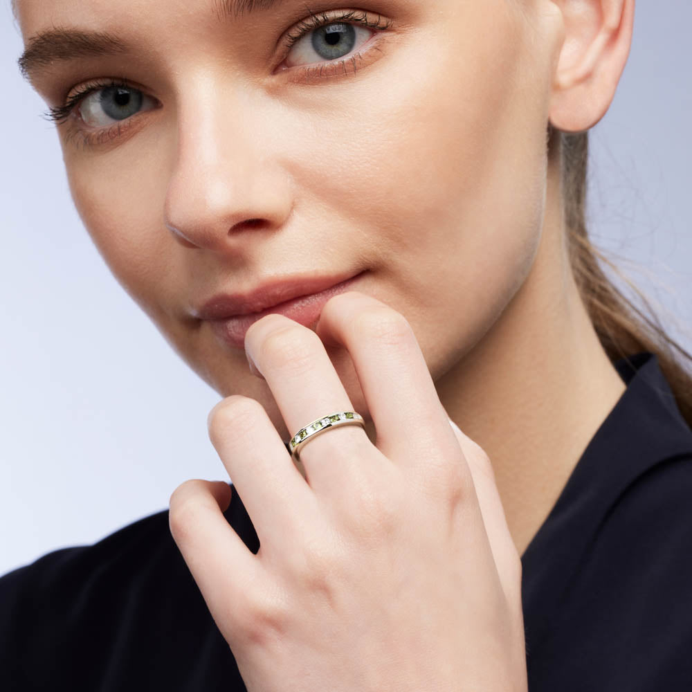 Unique and trendy, the Catriana Ring features round cut Green Australian Sapphires and white diamonds in an alternating pattern, set in an 18ct White Gold band, a durable and long lasting metal. Elevate your look with this stunning piece.
