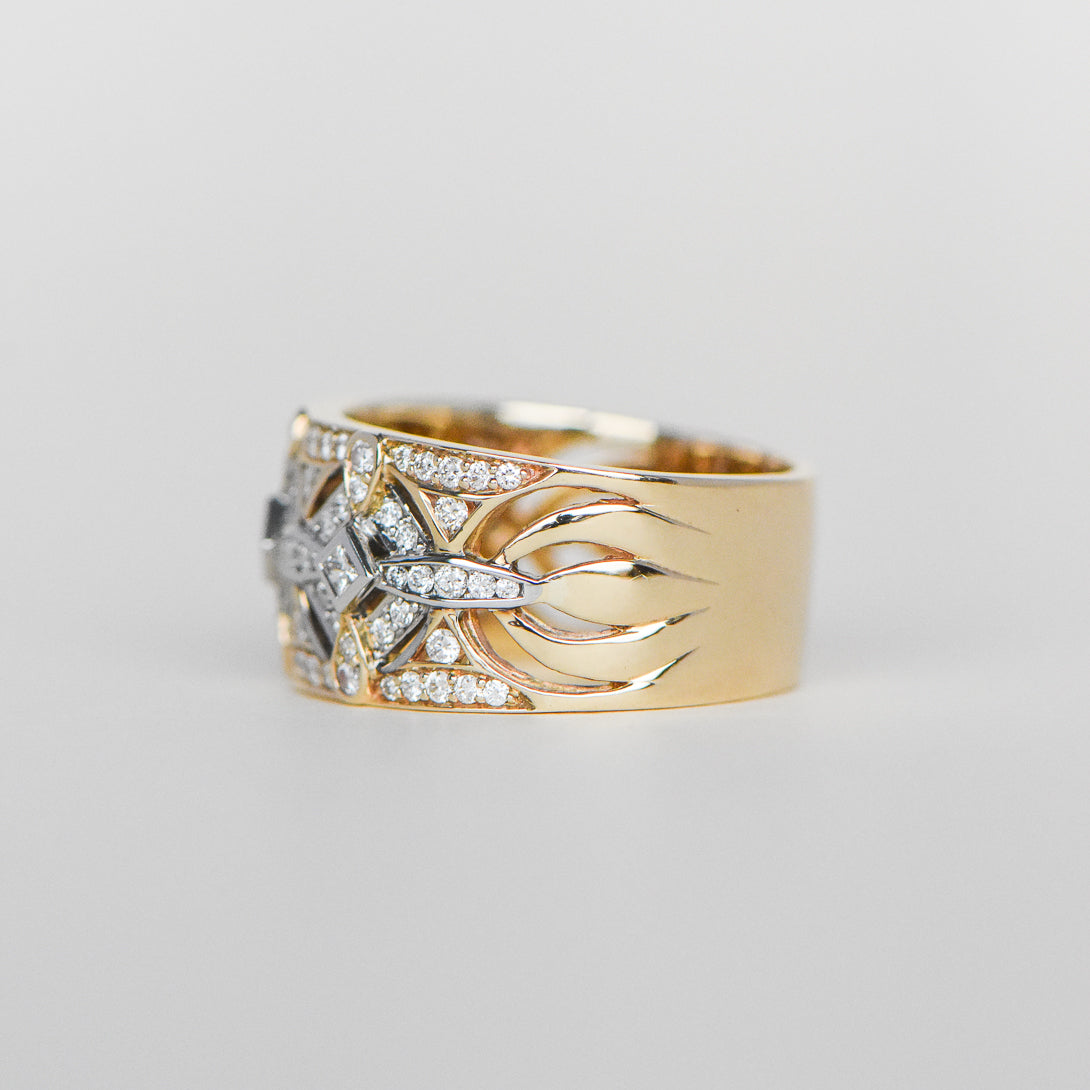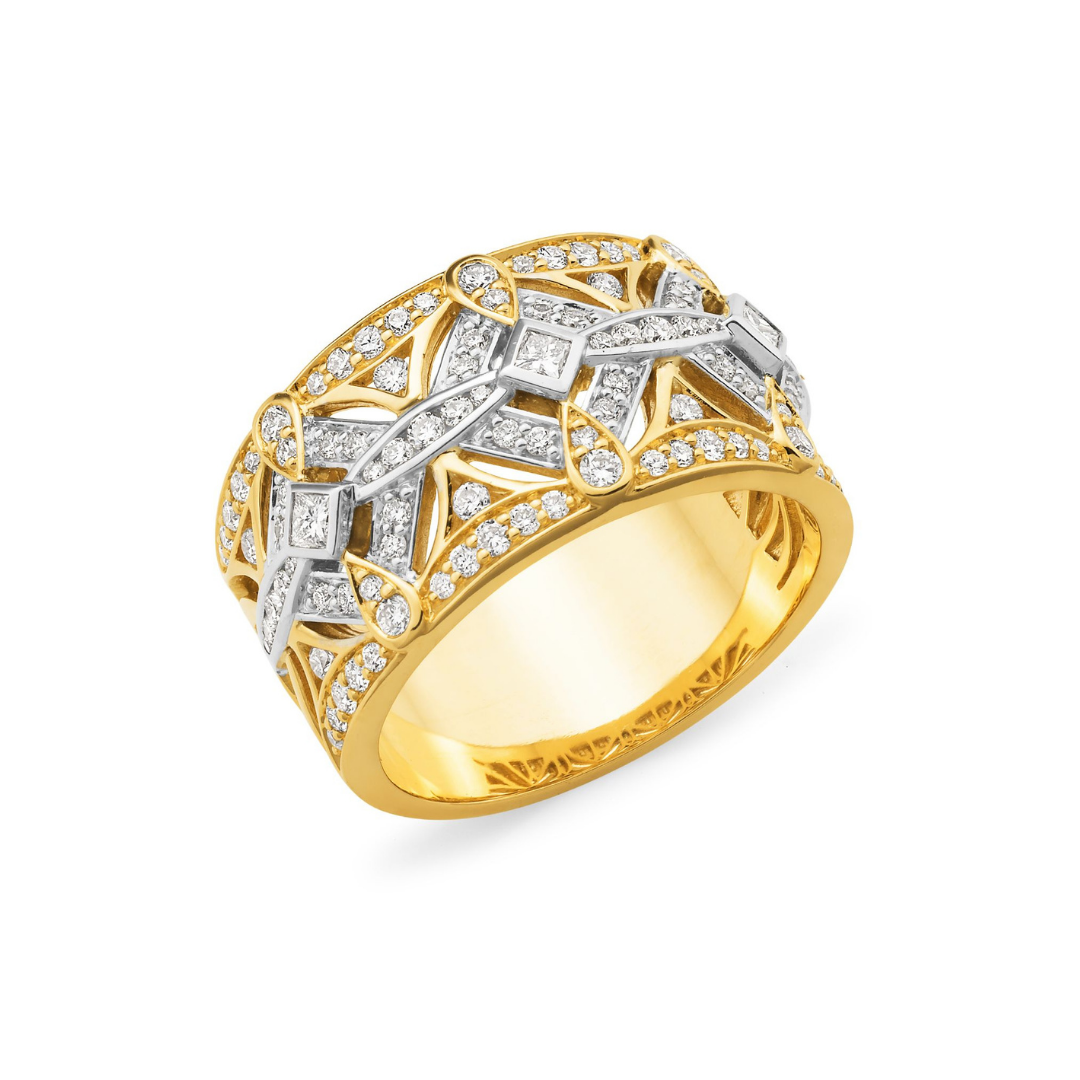 An embellishment of round brilliant and princess cut diamonds makes this 9k Yellow and White Gold wide band diamond ring a classic design popular for anniversaries and other special occasions.