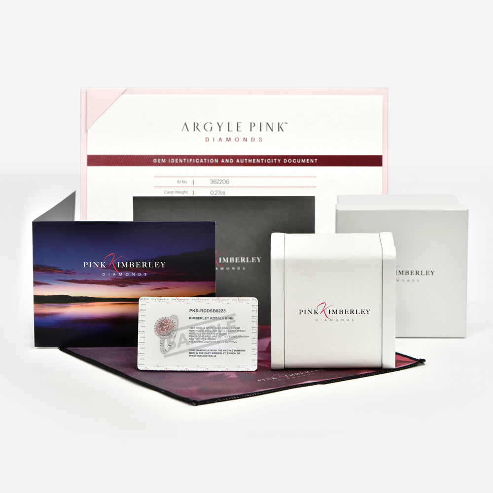 An exquisite round brilliant cut natural Pink Diamonds from the Argyle Mine set within three beautiful halos of fine oval cut white diamonds and small Pink Diamonds from the Argyle Mine.
